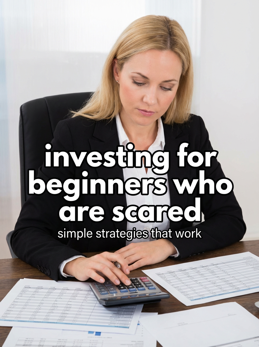 model in financial planning outfit at desk with financial documents and calculator, focused expression, professional lighting. TikTok-style text overlay with white text with black outline: "investing for beginners who are scared" smaller text: "(simple strategies that work)" , do not show tiktok interface or logo