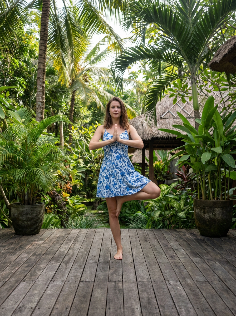 model in floral sundress doing yoga pose on wooden deck of jungle villa, surrounded by tropical foliage