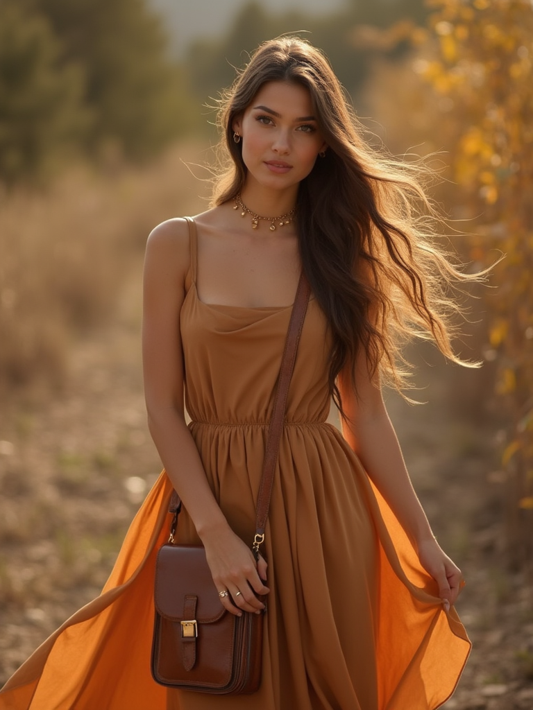 model in flowing caramel midi dress with brown leather accessories , autumn-inspired palette, elegant earth tones, golden hour lighting