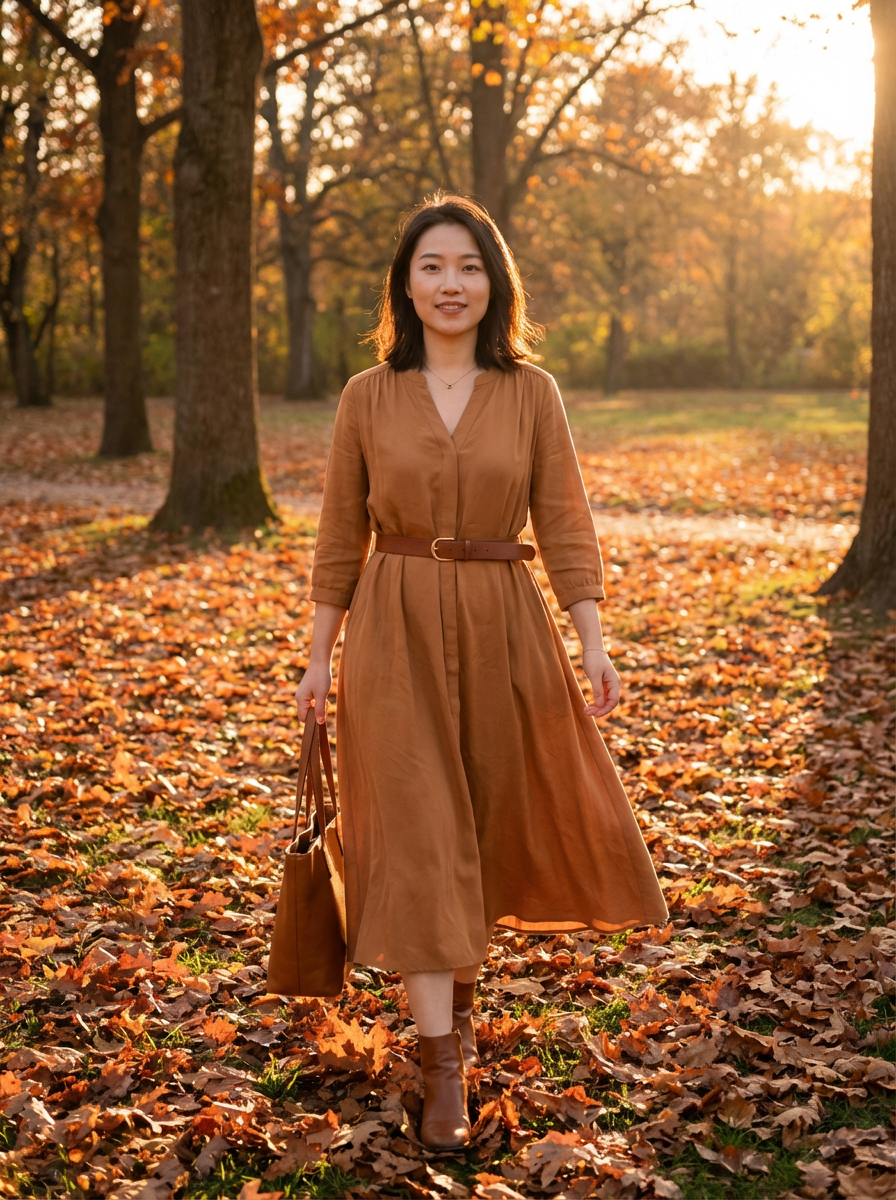 model in flowing caramel midi dress with brown leather accessories , autumn-inspired palette, elegant earth tones, golden hour lighting