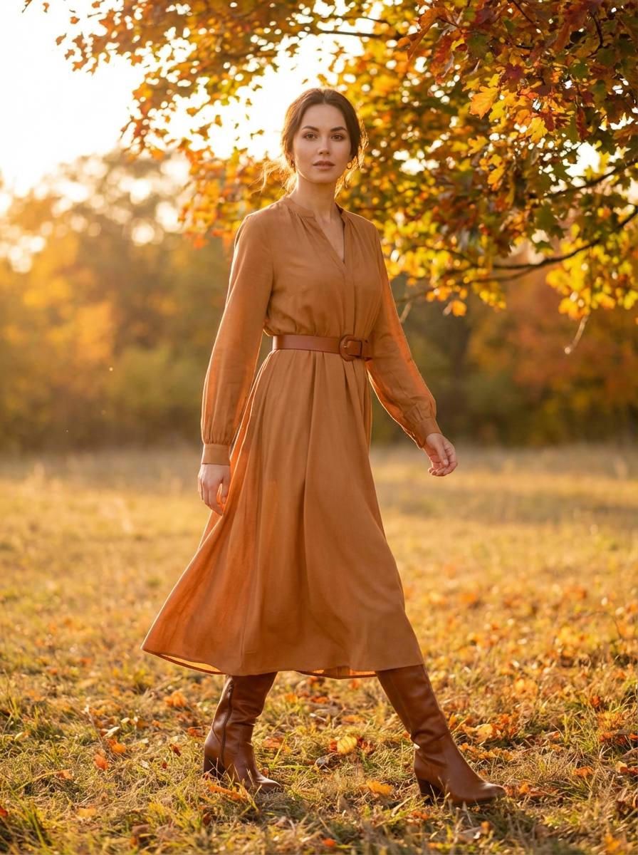 model in flowing caramel midi dress with brown leather accessories , autumn-inspired palette, elegant earth tones, golden hour lighting