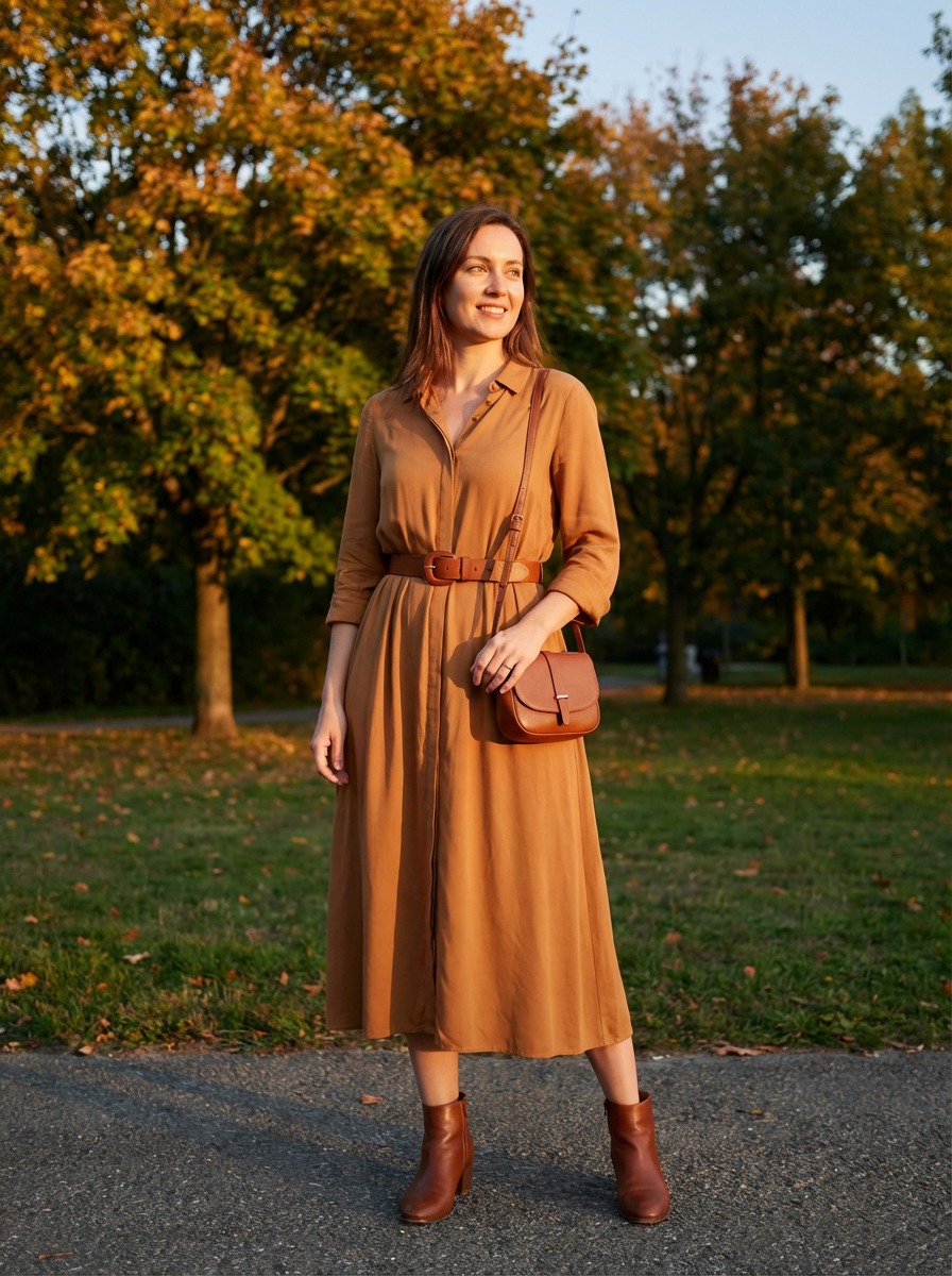 model in flowing caramel midi dress with brown leather accessories , autumn-inspired palette, elegant earth tones, golden hour lighting