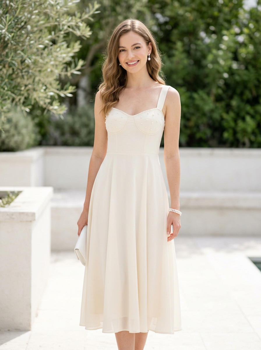 model in flowing cream midi dress with pearl accessories , all-white monochromatic look, elegant and airy, bright natural daylight