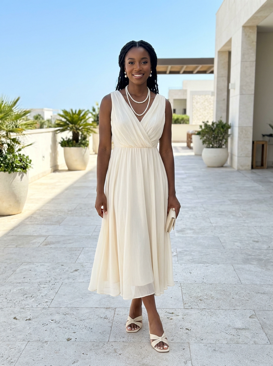 model in flowing cream midi dress with pearl accessories , all-white monochromatic look, elegant and airy, bright natural daylight