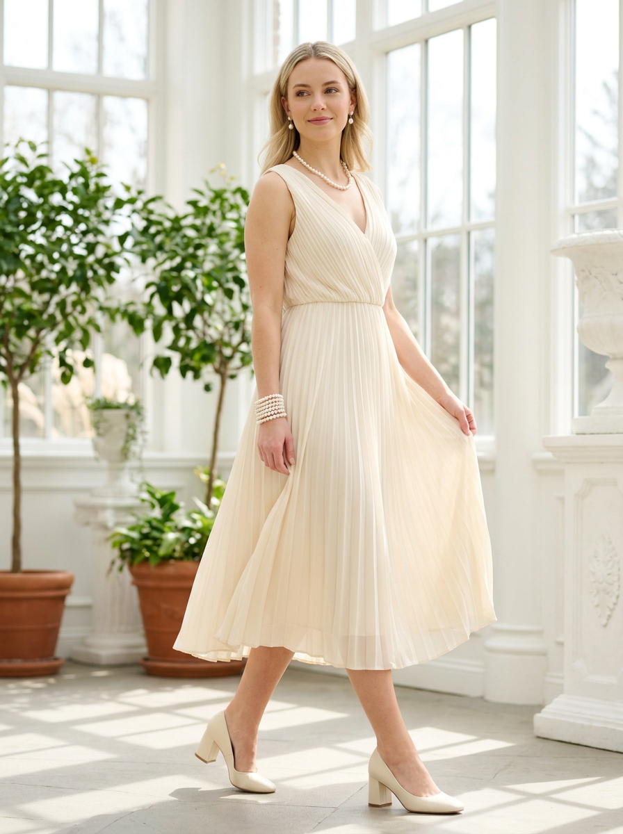 model in flowing cream midi dress with pearl accessories , all-white monochromatic look, elegant and airy, bright natural daylight