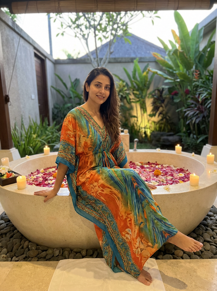 model in flowing kaftan at luxury spa villa with flower bath, candles and tropical decor