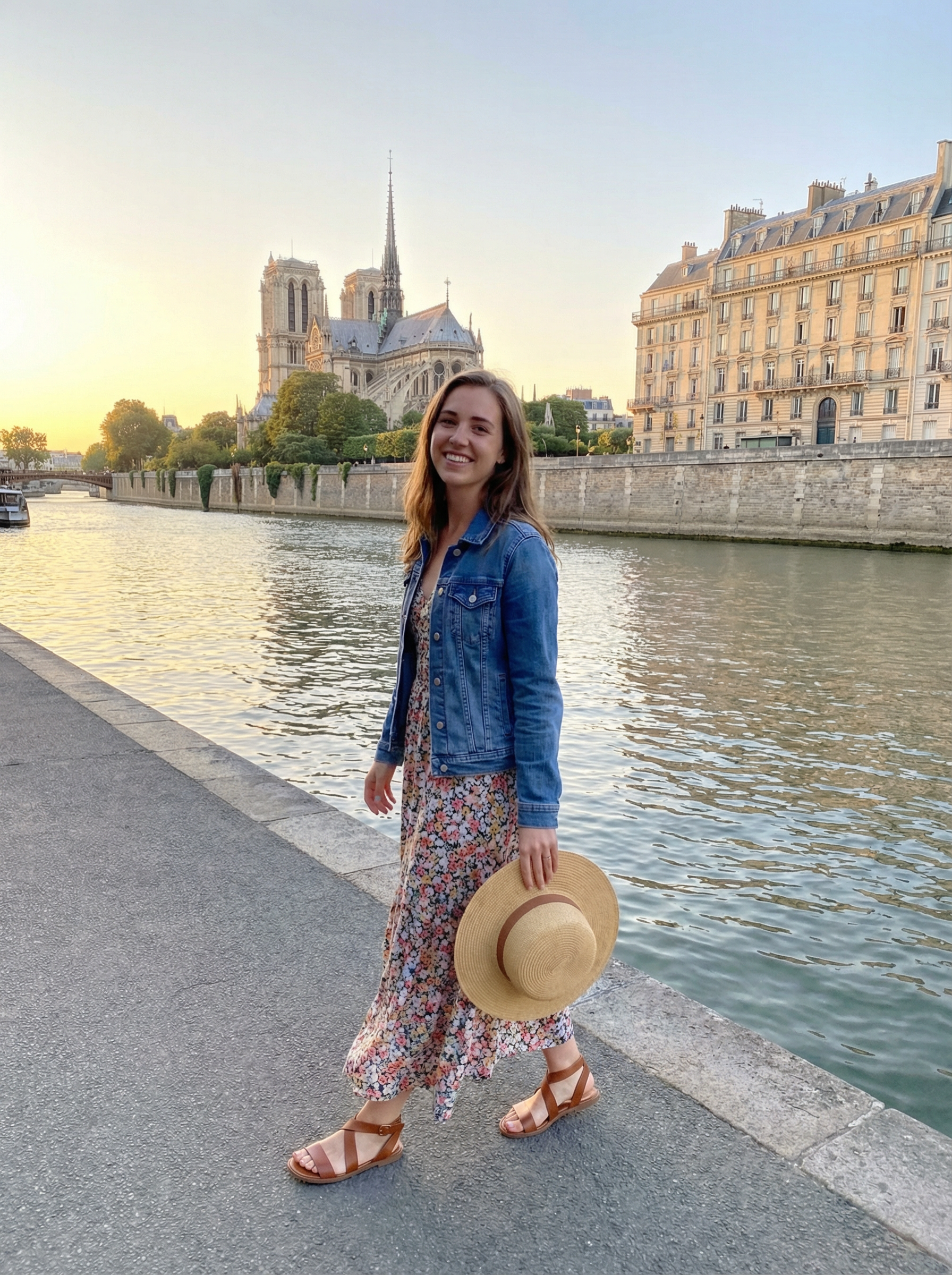model in flowy maxi dress, denim jacket, sandals, sun hat strolling along the Seine riverbank with Notre-Dame in background, romantic riverside walk, golden afternoon light reflecting on water, classic Parisian architecture, leisurely tourist moment