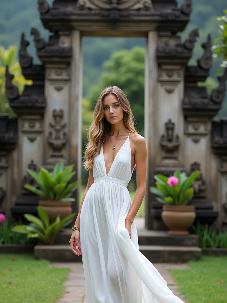 model in flowy white dress standing in front of traditional Balinese temple gate with intricate stone carvings, lush tropical plants and flowers in background