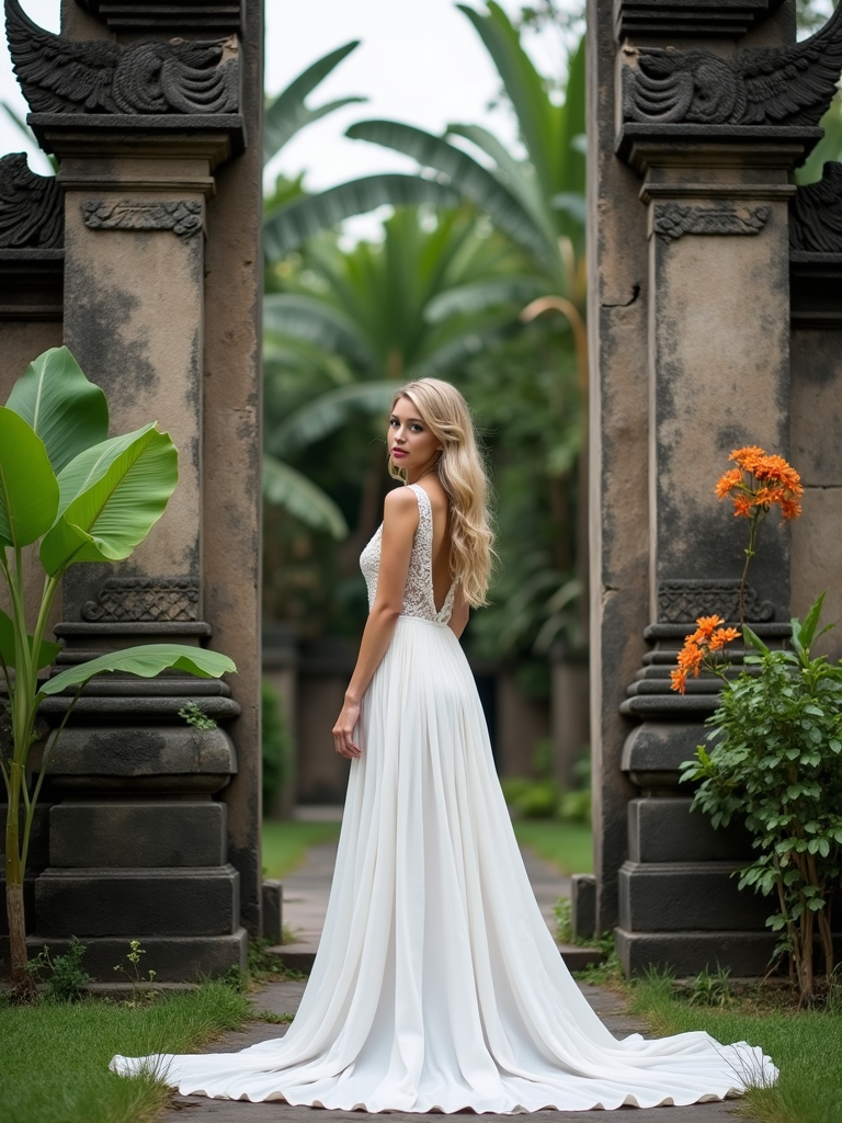 model in flowy white dress standing in front of traditional Balinese temple gate with intricate stone carvings, lush tropical plants and flowers in background