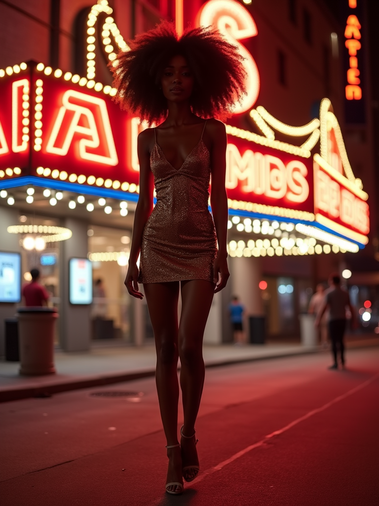 model in front of a famous Las Vegas show venue. at night. mini dress and high heels.