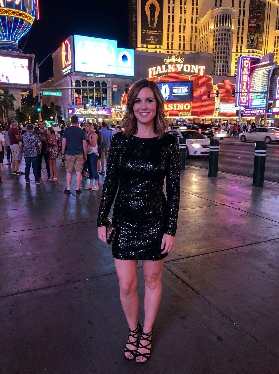 model in front of a famous Las Vegas show venue. at night. mini dress and high heels.