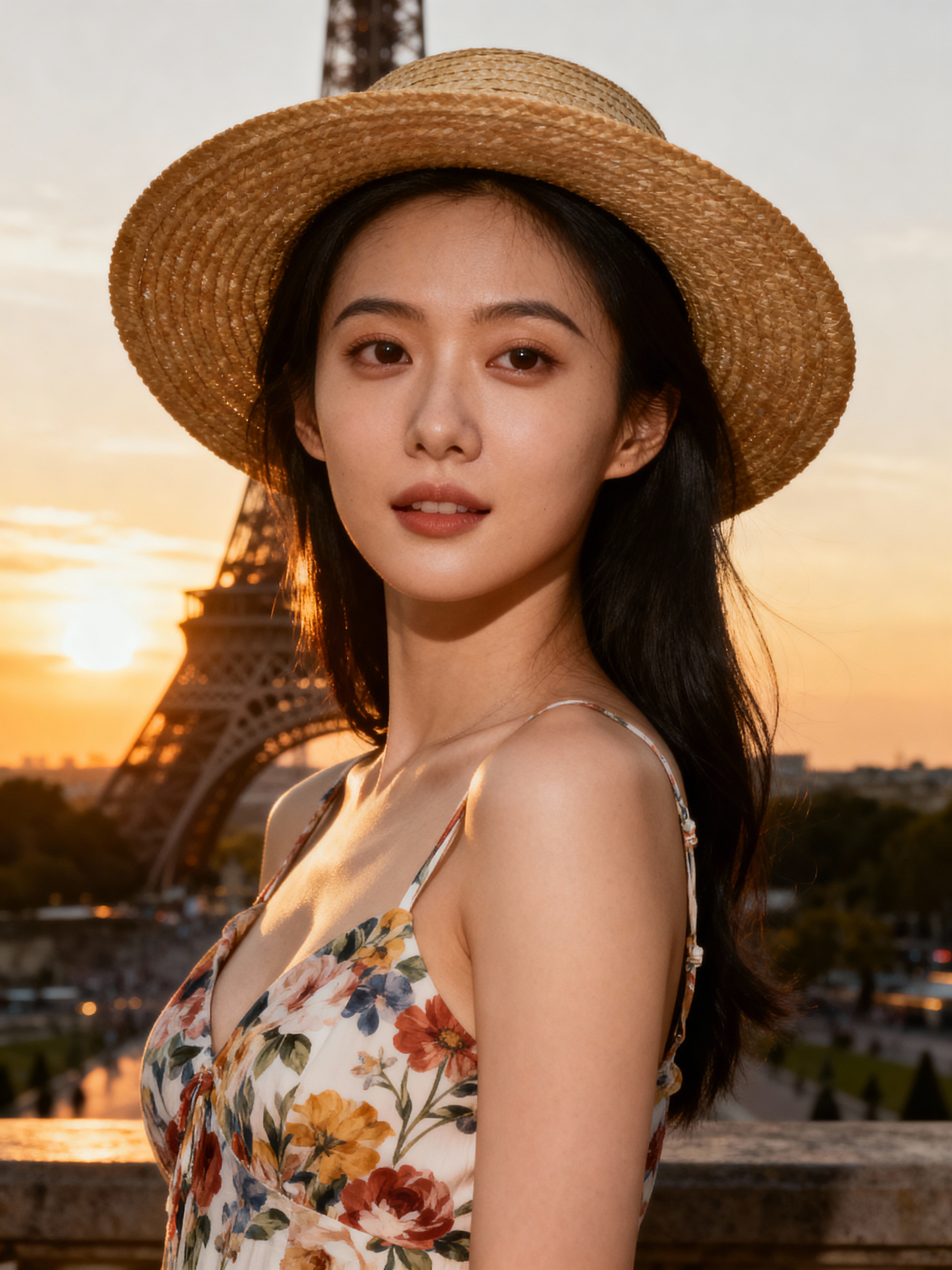 model in front of Eiffel Tower at sunset, wearing a floral summer dress with straw hat , golden hour lighting