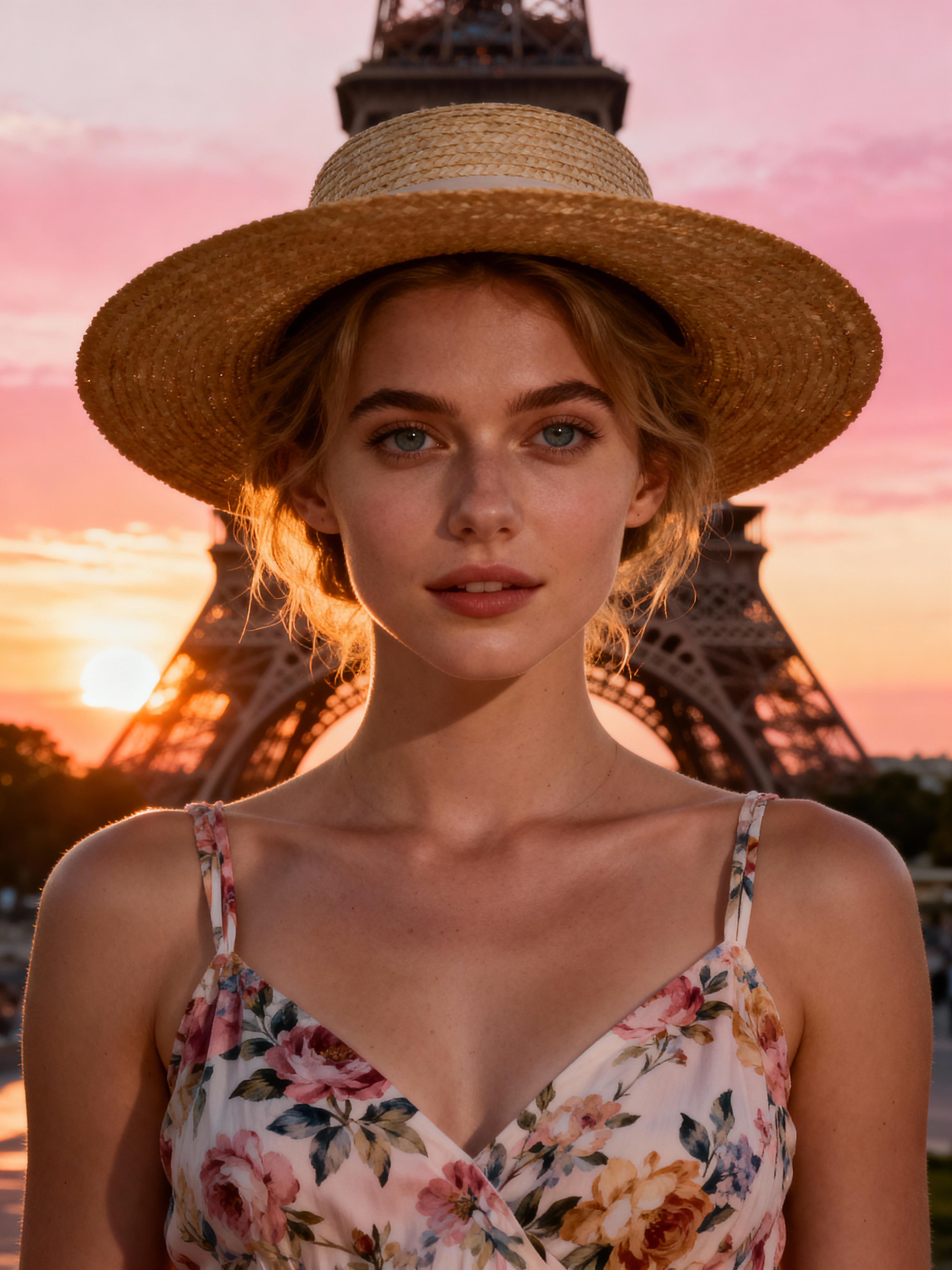 model in front of Eiffel Tower at sunset, wearing a floral summer dress with straw hat , golden hour lighting