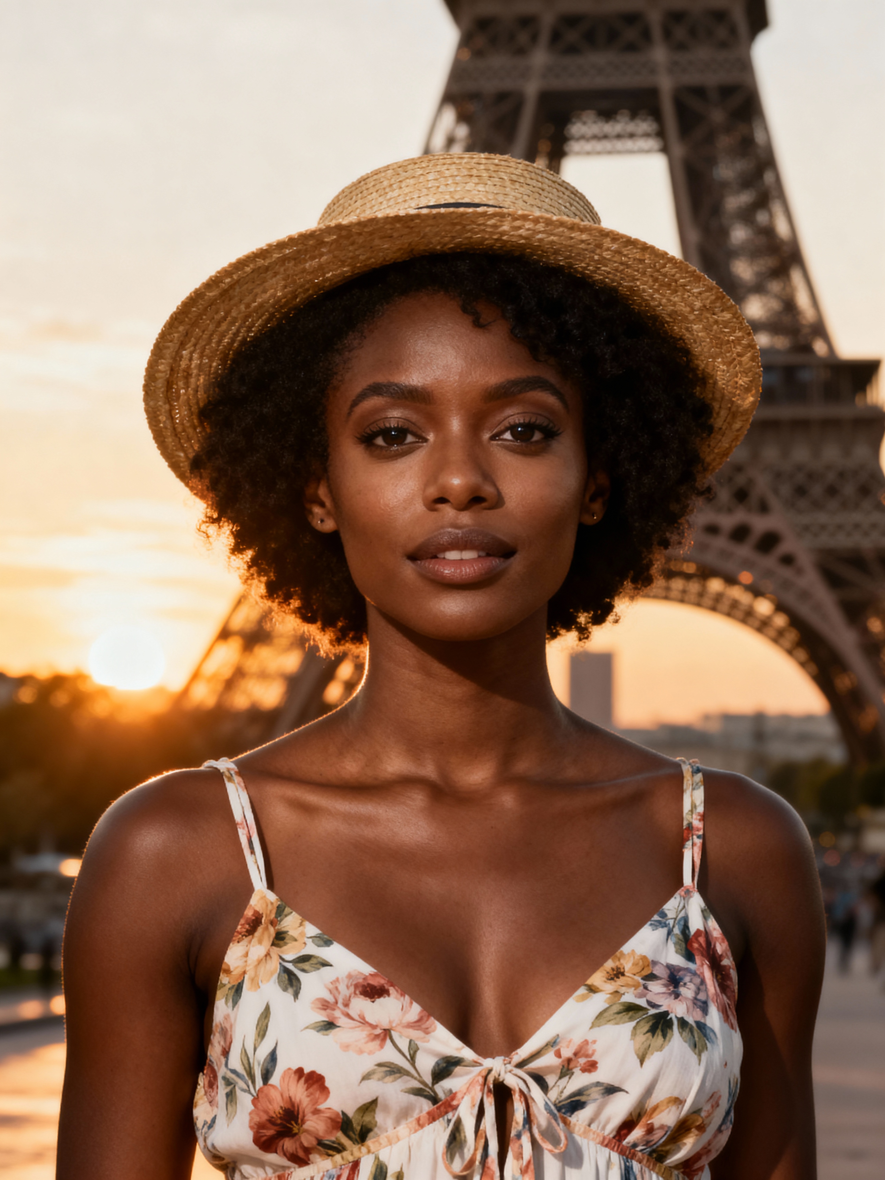 model in front of Eiffel Tower at sunset, wearing a floral summer dress with straw hat , golden hour lighting