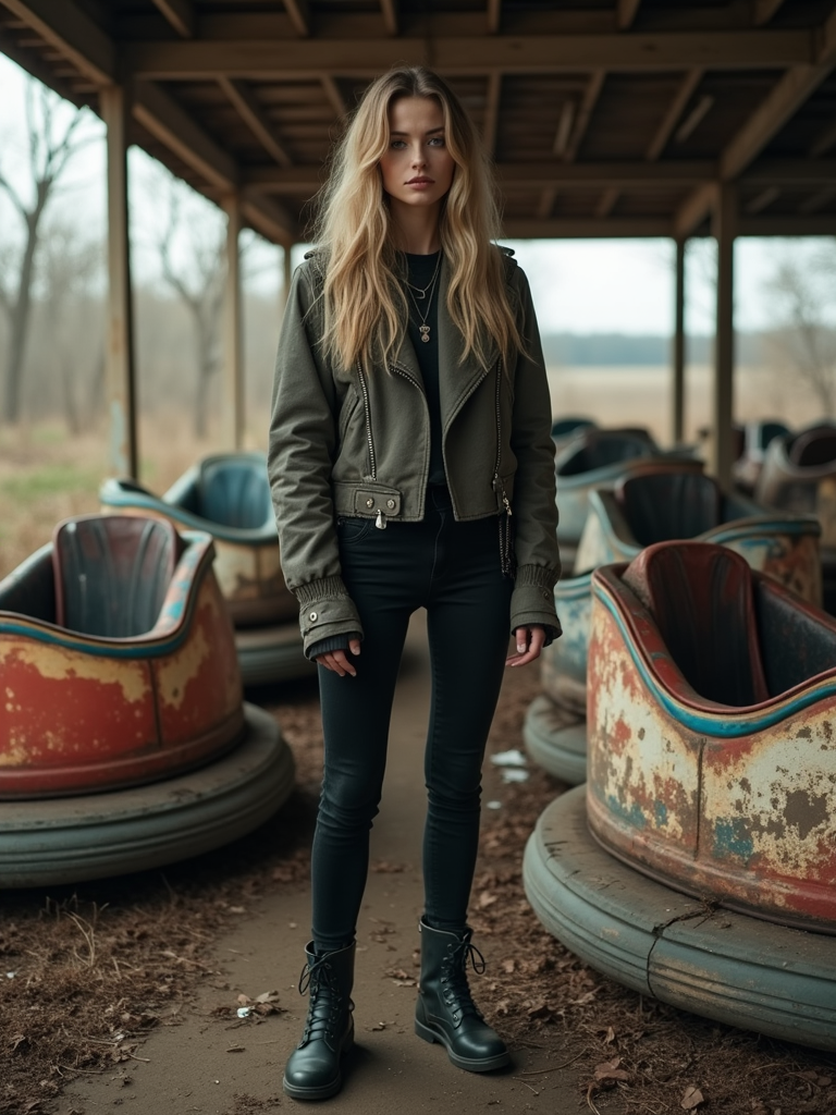 model in front of rusty bumper cars in abandoned overgrown amusement park in Chernobyl. wearing black boots and black pants.