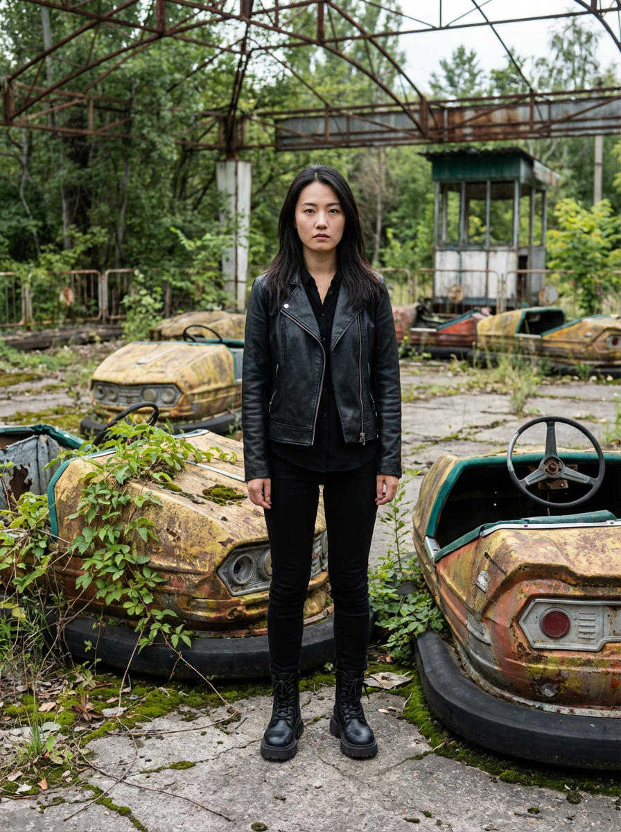 model in front of rusty bumper cars in abandoned overgrown amusement park in Chernobyl. wearing black boots and black pants.