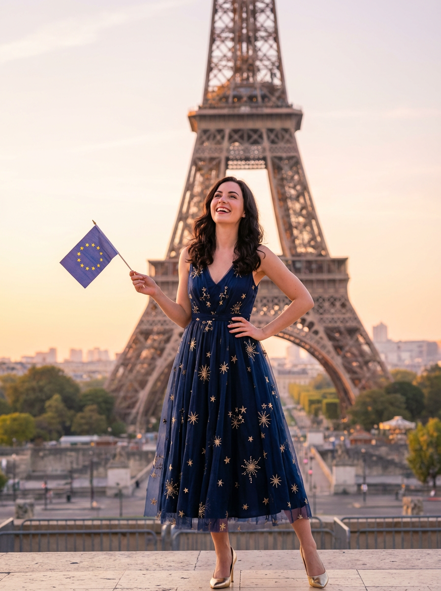 model in front of the iconic Eiffel Tower, wearing an elegant blue dress with gold star accents , striking a proud pose with a small European flag, Paris cityscape creating a romantic, inspiring atmosphere