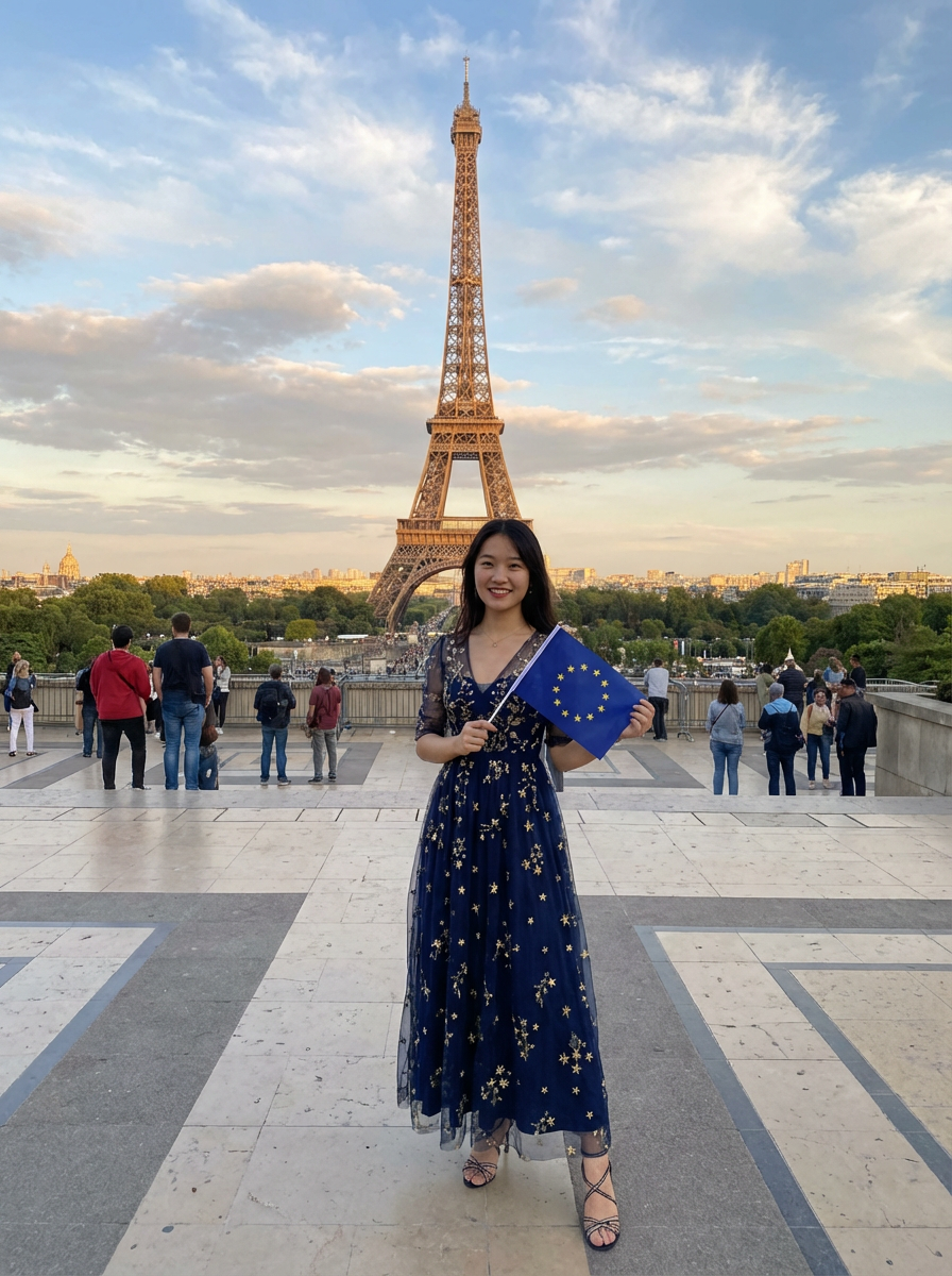 model in front of the iconic Eiffel Tower, wearing an elegant blue dress with gold star accents , striking a proud pose with a small European flag, Paris cityscape creating a romantic, inspiring atmosphere