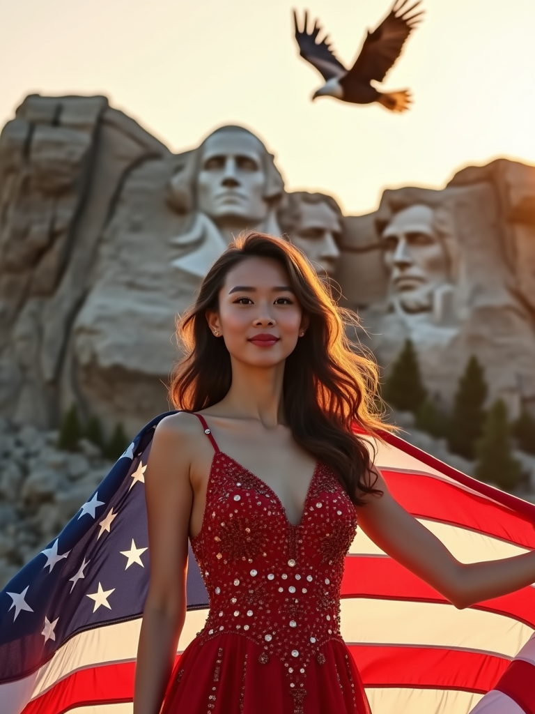 model in front of the iconic Mount Rushmore, wearing a red, white, and blue sequined dress with star patterns , striking a proud pose with the American flag draped around her shoulders, golden hour lighting creating a warm, inspiring atmosphere, bald eagle soaring overhead