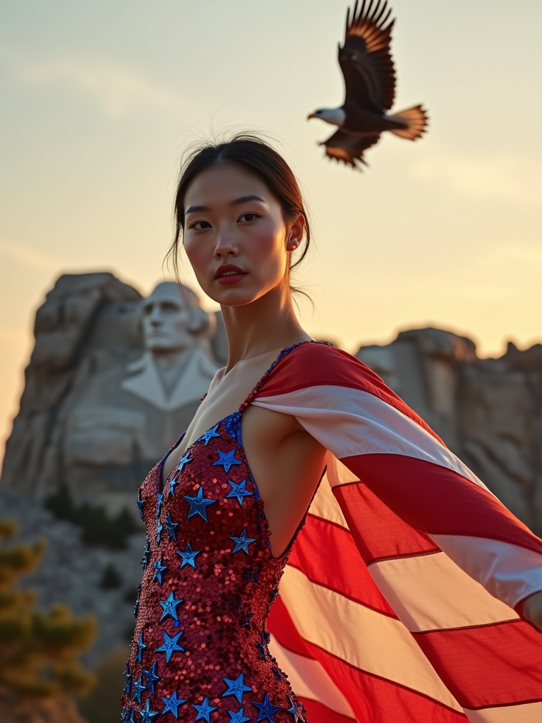 model in front of the iconic Mount Rushmore, wearing a red, white, and blue sequined dress with star patterns , striking a proud pose with the American flag draped around her shoulders, golden hour lighting creating a warm, inspiring atmosphere, bald eagle soaring overhead