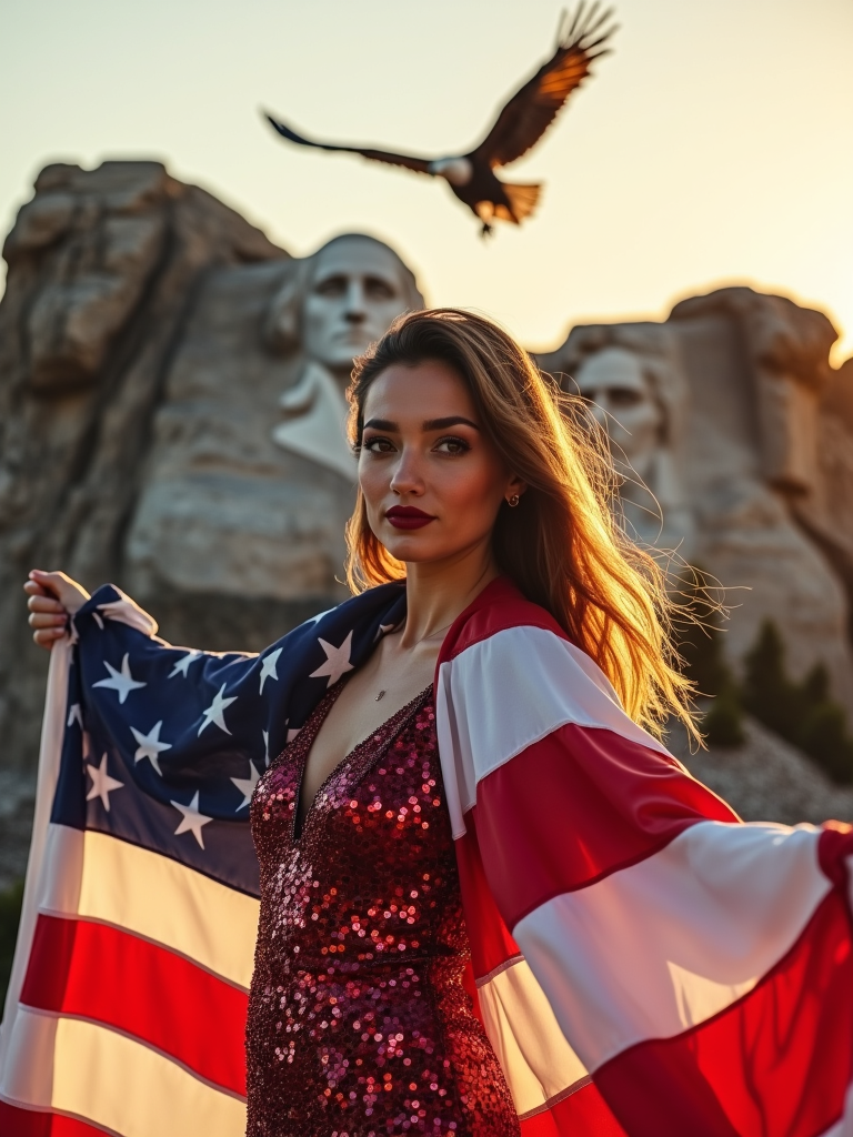 model in front of the iconic Mount Rushmore, wearing a red, white, and blue sequined dress with star patterns , striking a proud pose with the American flag draped around her shoulders, golden hour lighting creating a warm, inspiring atmosphere, bald eagle soaring overhead
