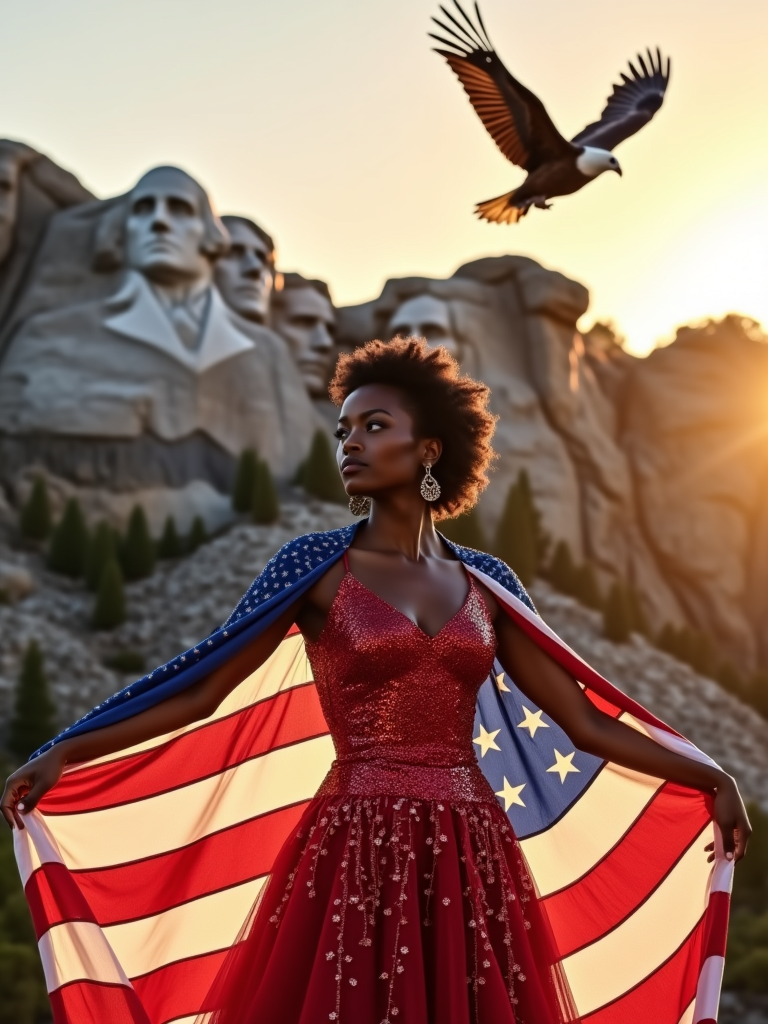 model in front of the iconic Mount Rushmore, wearing a red, white, and blue sequined dress with star patterns , striking a proud pose with the American flag draped around her shoulders, golden hour lighting creating a warm, inspiring atmosphere, bald eagle soaring overhead