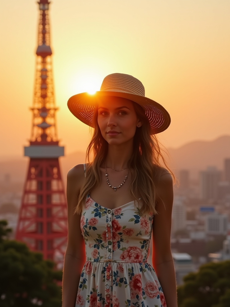 model in front of Tokyo Tower at sunset, wearing a floral summer dress with straw hat , golden hour lighting