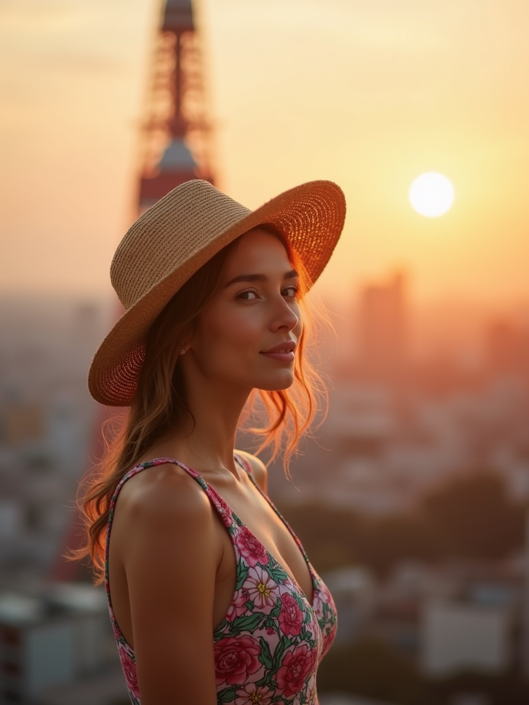 model in front of Tokyo Tower at sunset, wearing a floral summer dress with straw hat , golden hour lighting