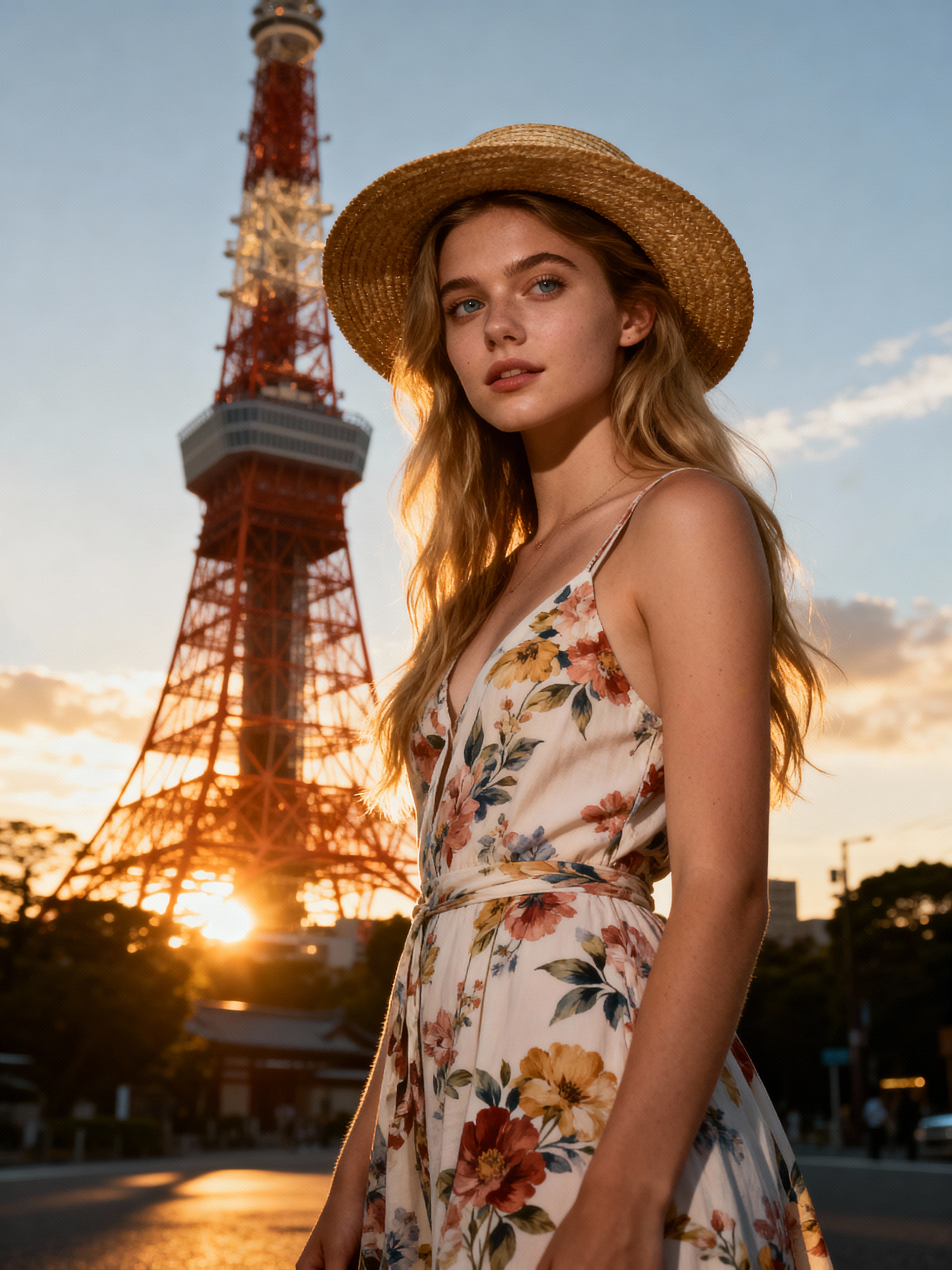 model in front of Tokyo Tower at sunset, wearing a floral summer dress with straw hat , golden hour lighting
