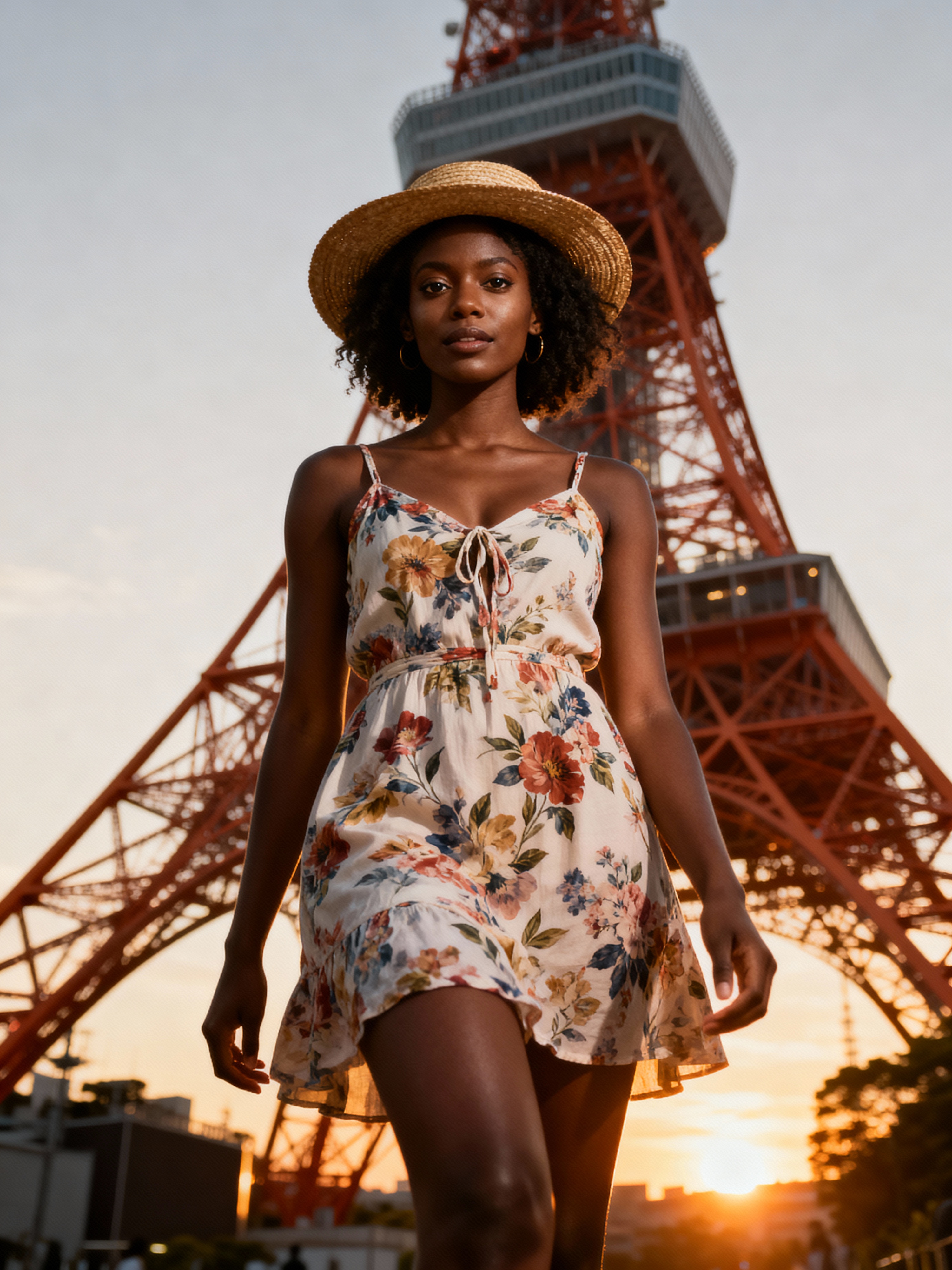 model in front of Tokyo Tower at sunset, wearing a floral summer dress with straw hat , golden hour lighting
