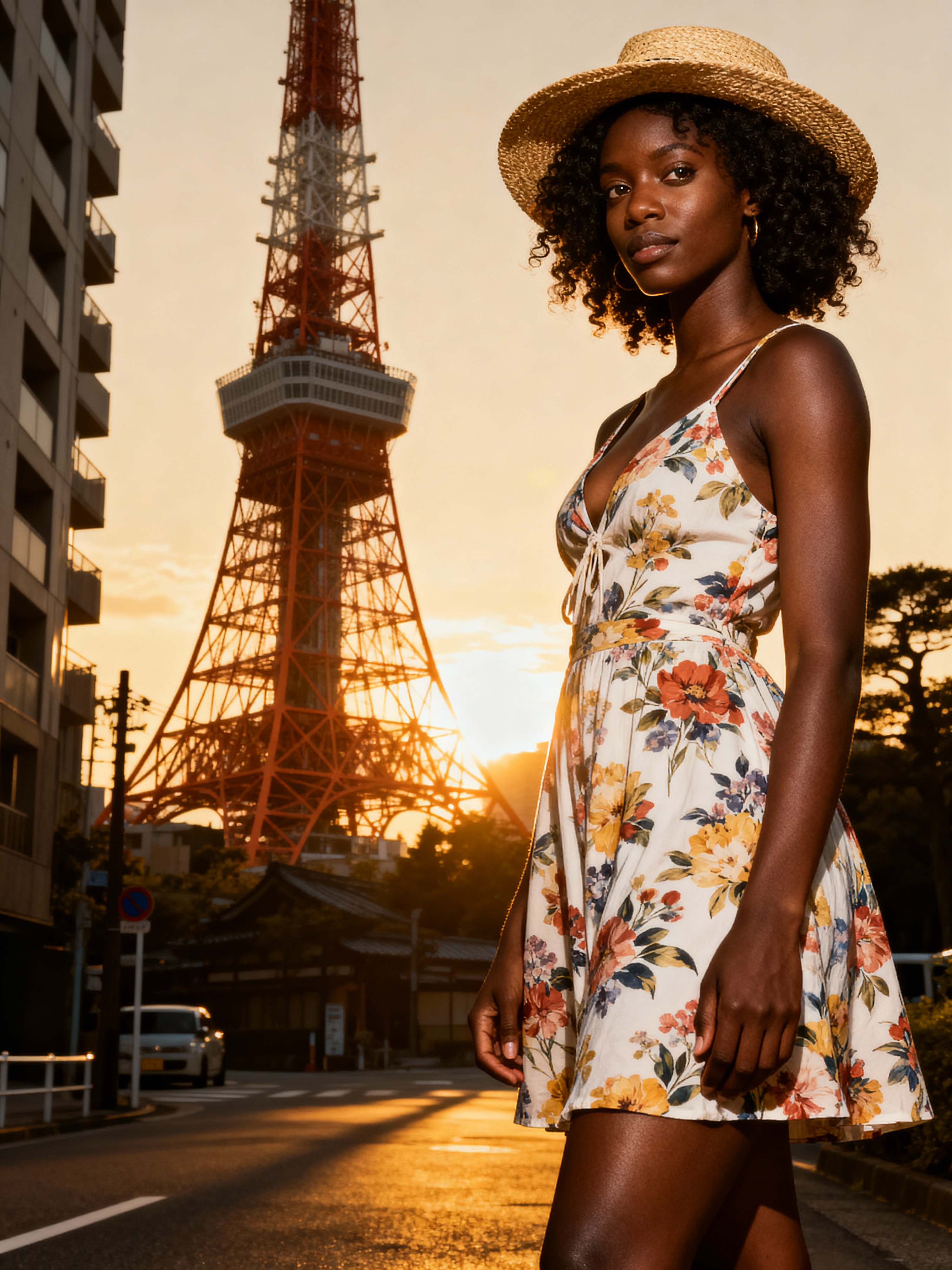 model in front of Tokyo Tower at sunset, wearing a floral summer dress with straw hat , golden hour lighting