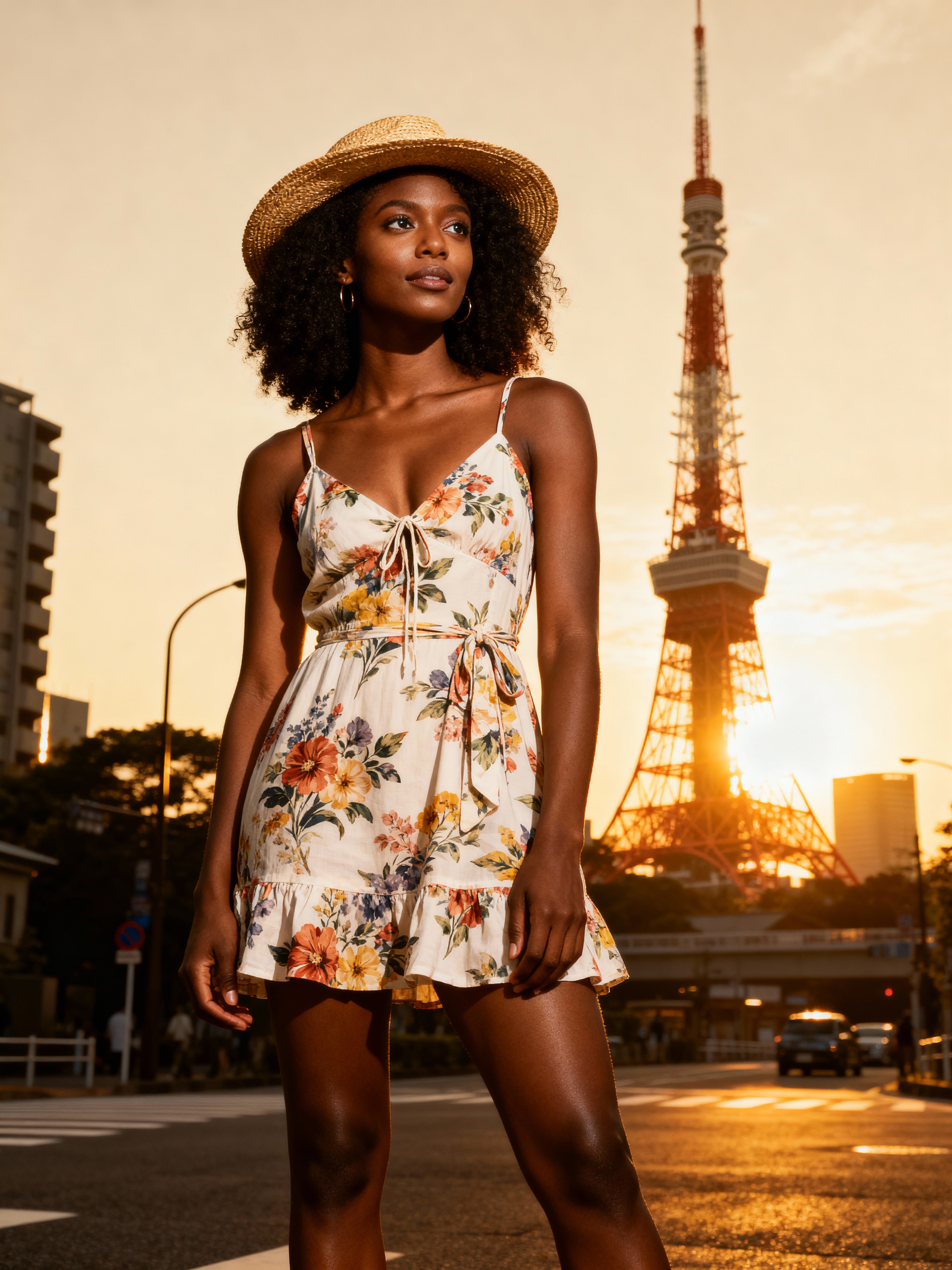 model in front of Tokyo Tower at sunset, wearing a floral summer dress with straw hat , golden hour lighting