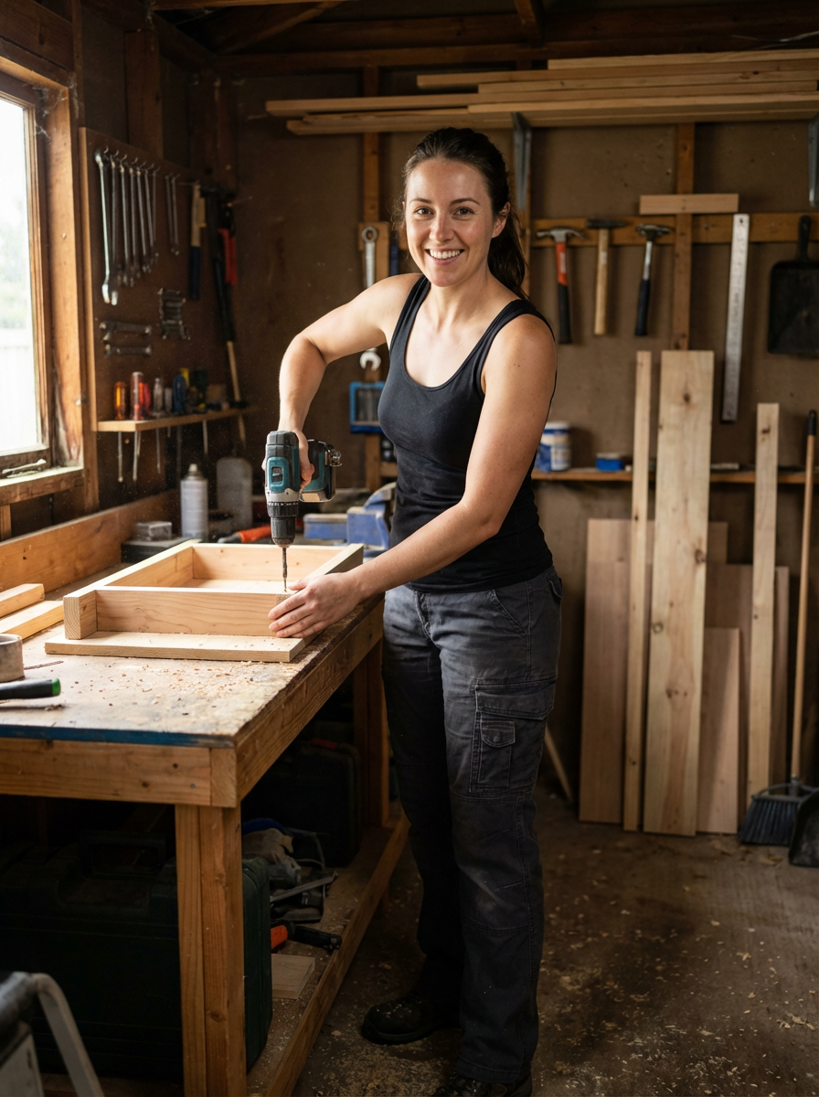 model in garage workshop, DIY project, tools visible, casual work clothes, productive moment