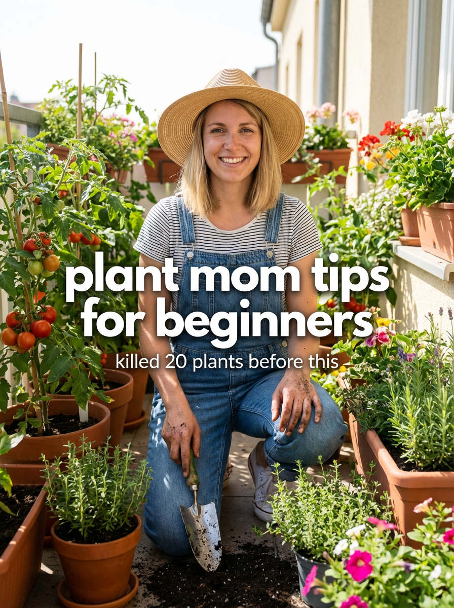 model in gardening outfit tending to plants in apartment or balcony garden, natural sunlight, green plants everywhere. TikTok text overlay: "plant mom tips for beginners" smaller text: "(killed 20 plants before this)" , do not show tiktok interface
