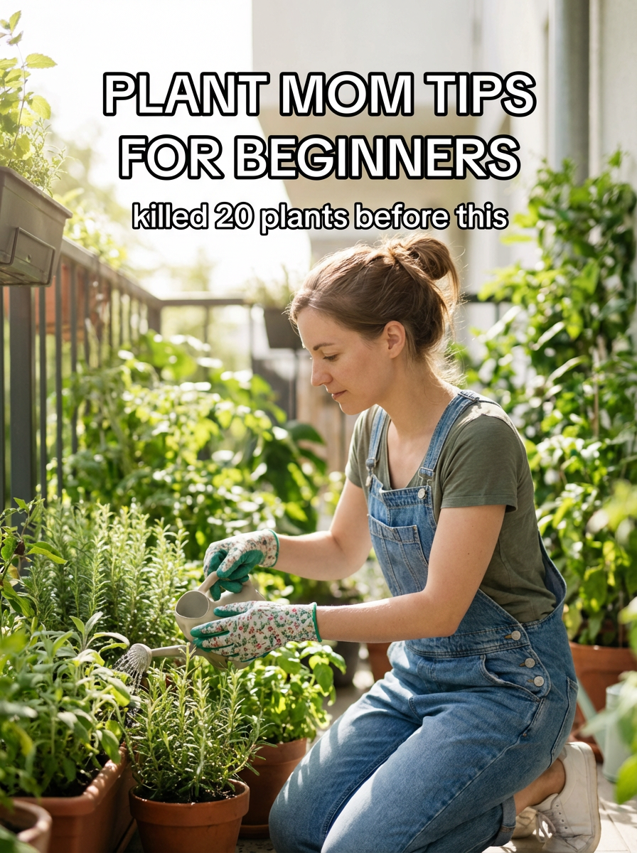 model in gardening outfit tending to plants in apartment or balcony garden, natural sunlight, green plants everywhere. TikTok TikTok-style text overlay with white text with black outline: "plant mom tips for beginners" smaller text: "(killed 20 plants before this)" , do not show tiktok interface or logo