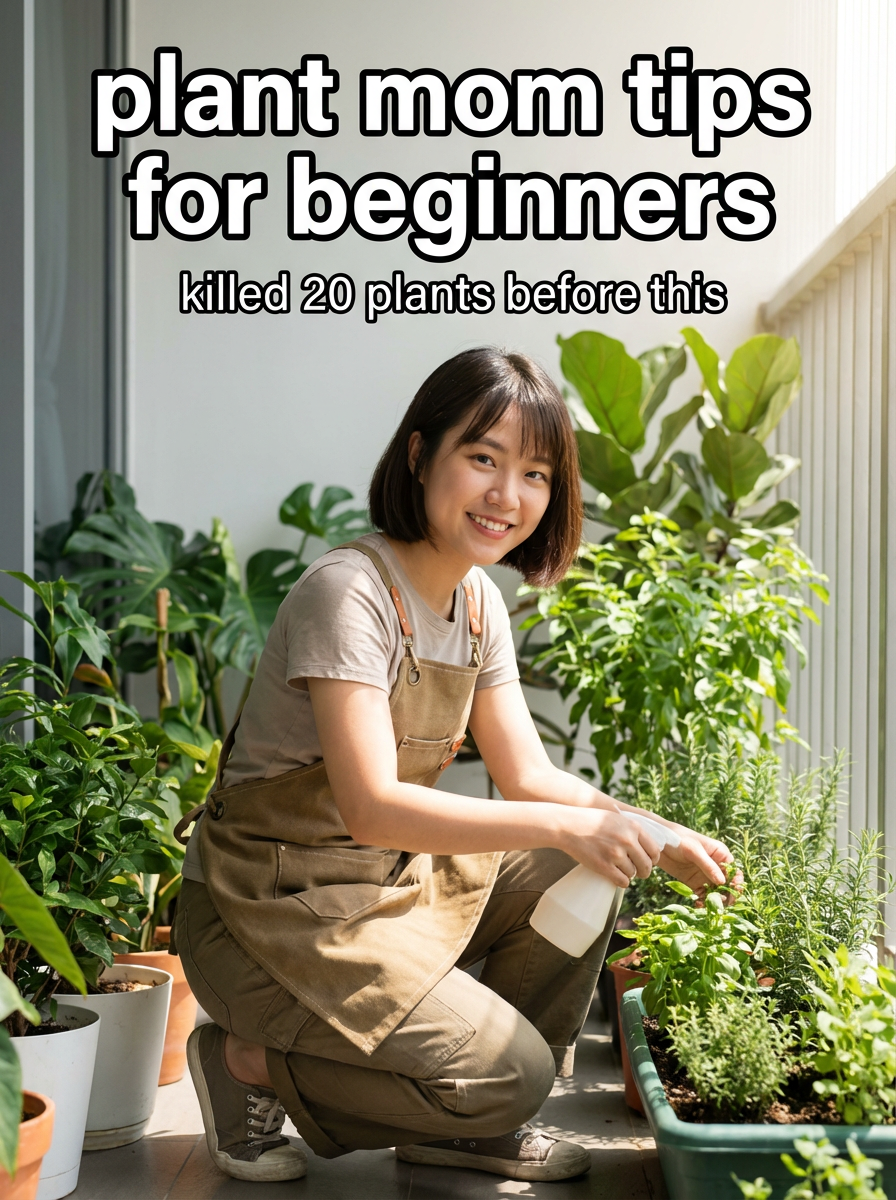model in gardening outfit tending to plants in apartment or balcony garden, natural sunlight, green plants everywhere. TikTok TikTok-style text overlay with white text with black outline: "plant mom tips for beginners" smaller text: "(killed 20 plants before this)" , do not show tiktok interface or logo
