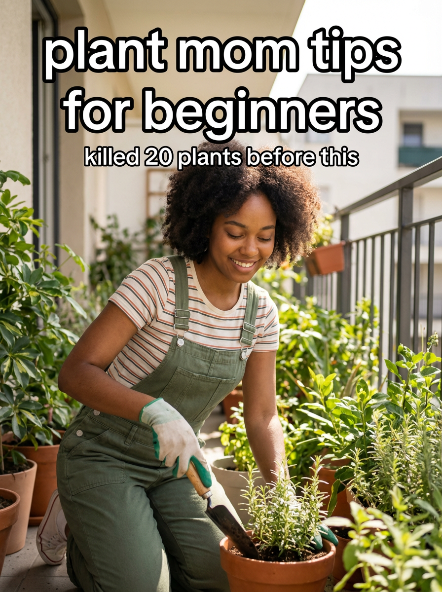 model in gardening outfit tending to plants in apartment or balcony garden, natural sunlight, green plants everywhere. TikTok TikTok-style text overlay with white text with black outline: "plant mom tips for beginners" smaller text: "(killed 20 plants before this)" , do not show tiktok interface or logo