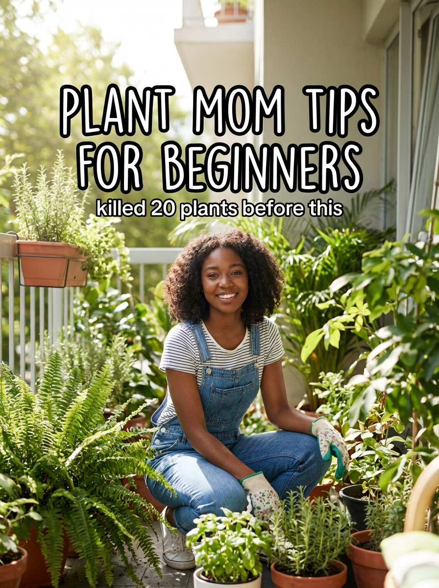 model in gardening outfit tending to plants in apartment or balcony garden, natural sunlight, green plants everywhere. TikTok-style text overlay with white text with black outline: "plant mom tips for beginners" smaller text: "(killed 20 plants before this)" , do not show tiktok interface or logo
