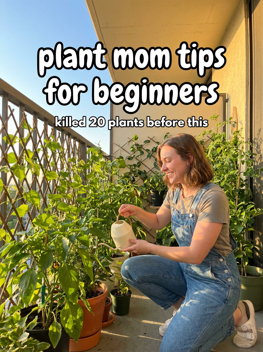 model in gardening outfit tending to plants in apartment or balcony garden, natural sunlight, green plants everywhere. TikTok-style text overlay with white text with black outline: "plant mom tips for beginners" smaller text: "(killed 20 plants before this)" , do not show tiktok interface or logo