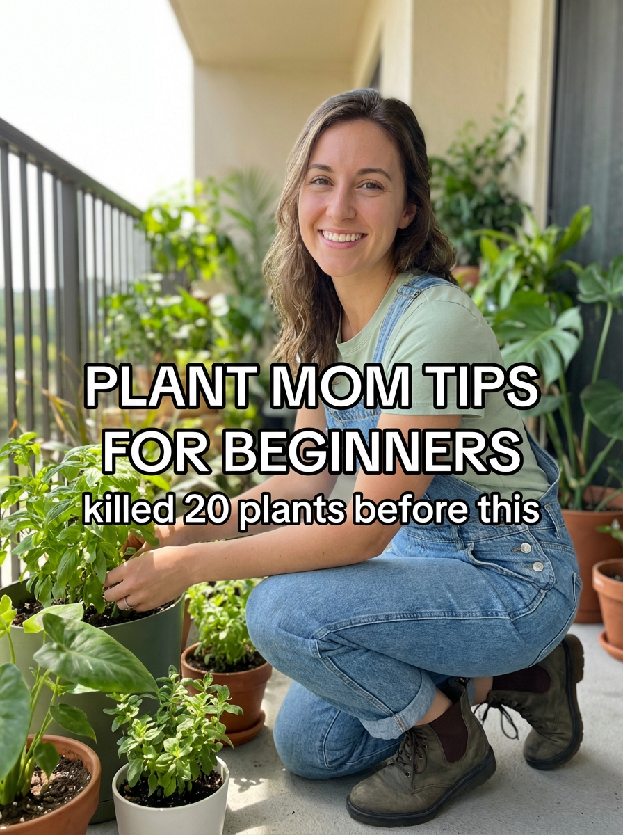 model in gardening outfit tending to plants in apartment or balcony garden, natural sunlight, green plants everywhere. TikTok-style text overlay with white text with black outline: "plant mom tips for beginners" smaller text: "(killed 20 plants before this)" , do not show tiktok interface or logo