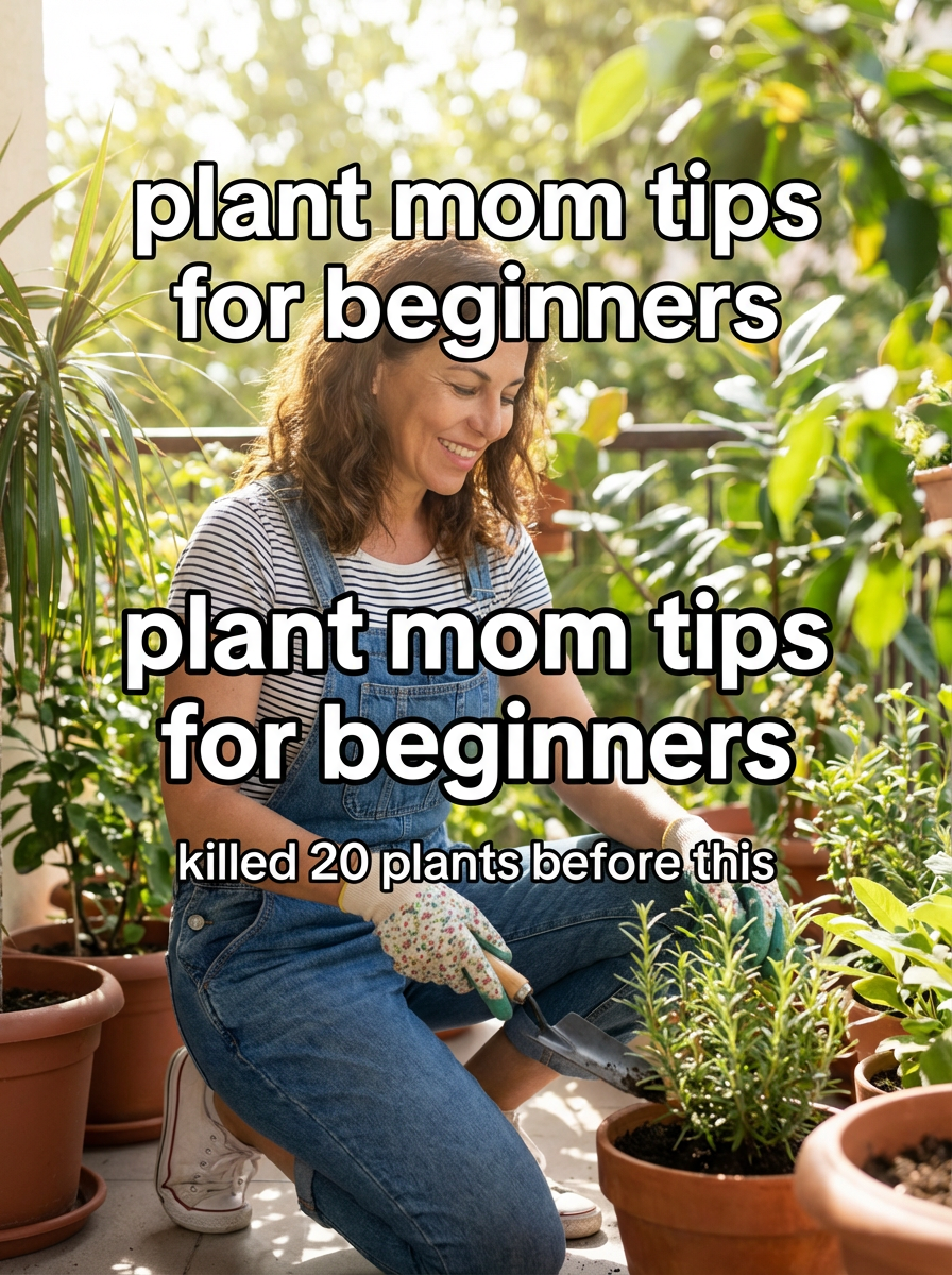 model in gardening outfit tending to plants in apartment or balcony garden, natural sunlight, green plants everywhere. TikTok-style text overlay with white text with black outline: "plant mom tips for beginners" smaller text: "(killed 20 plants before this)" , do not show tiktok interface or logo