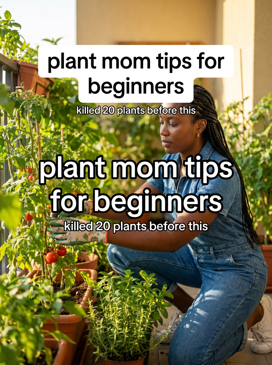 model in gardening outfit tending to plants in apartment or balcony garden, natural sunlight, green plants everywhere. TikTok-style text overlay with white text with black outline: "plant mom tips for beginners" smaller text: "(killed 20 plants before this)" , do not show tiktok interface or logo