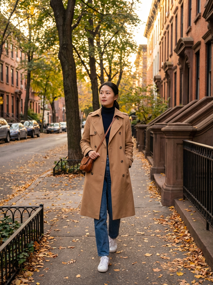 model in Greenwich Village, tree-lined street, brownstones, casual NYC style, autumn afternoon