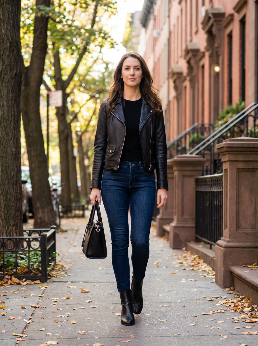 model in Greenwich Village, tree-lined street, brownstones, casual NYC style, autumn afternoon