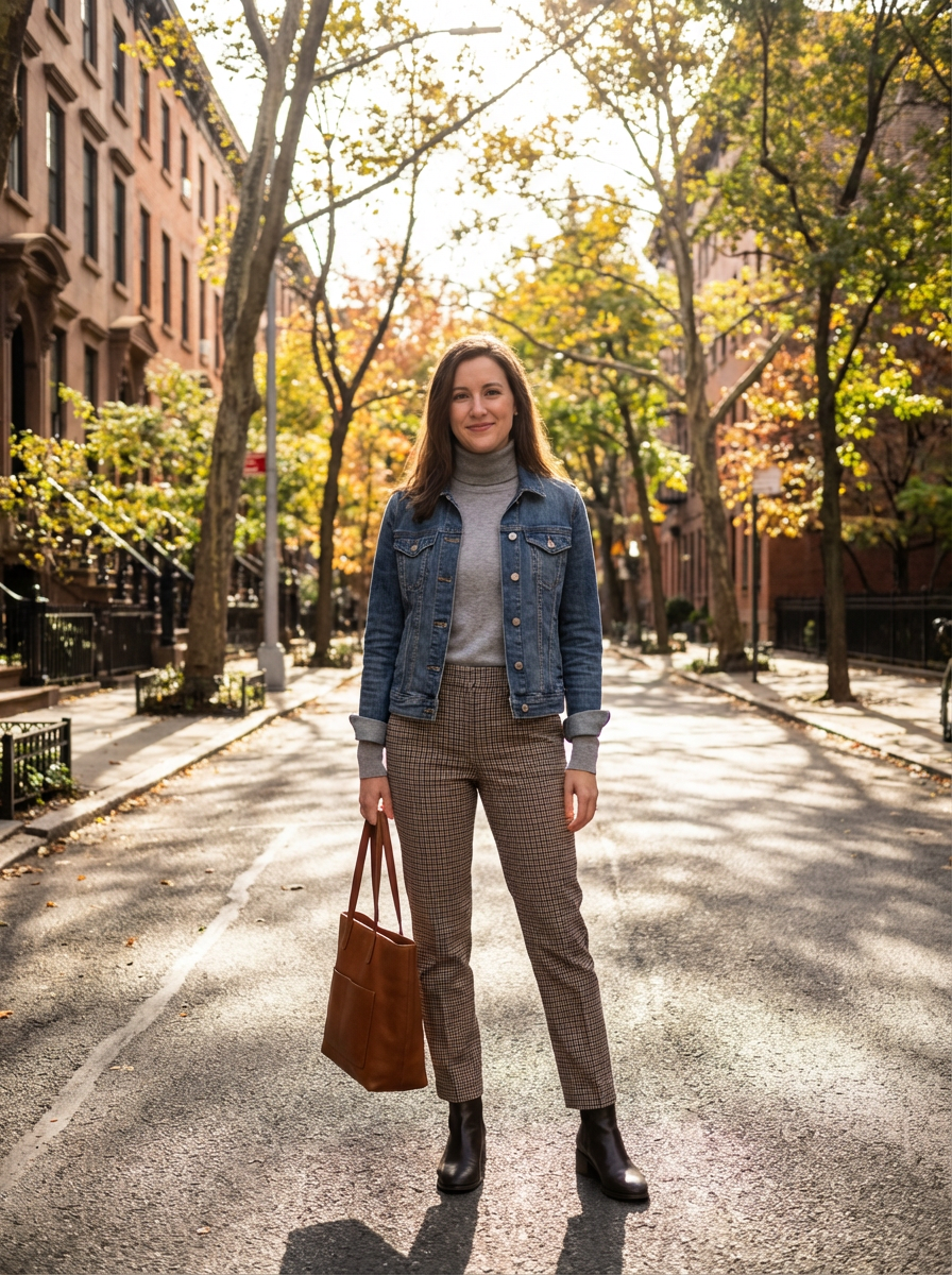 model in Greenwich Village, tree-lined street, brownstones, casual NYC style, autumn afternoon