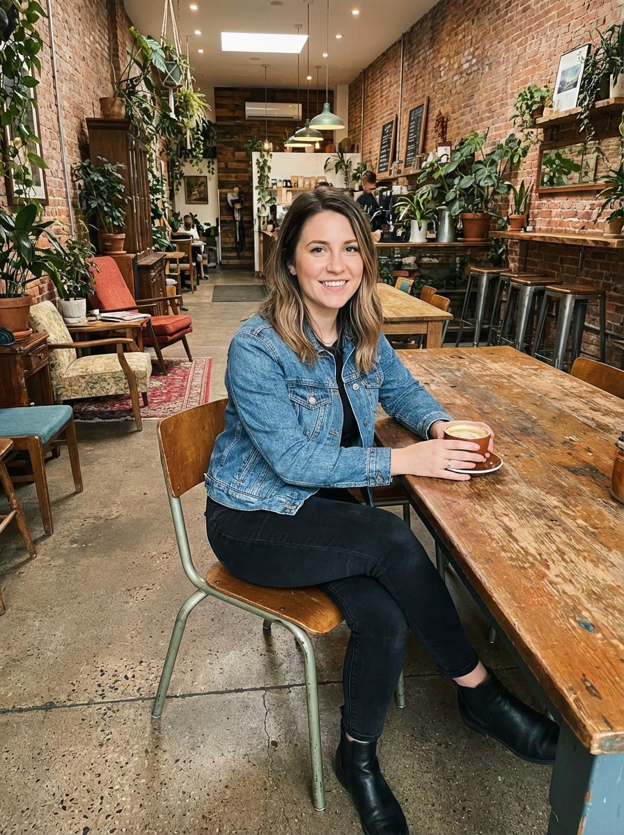 model in hipster coffee place with coffee cup on table