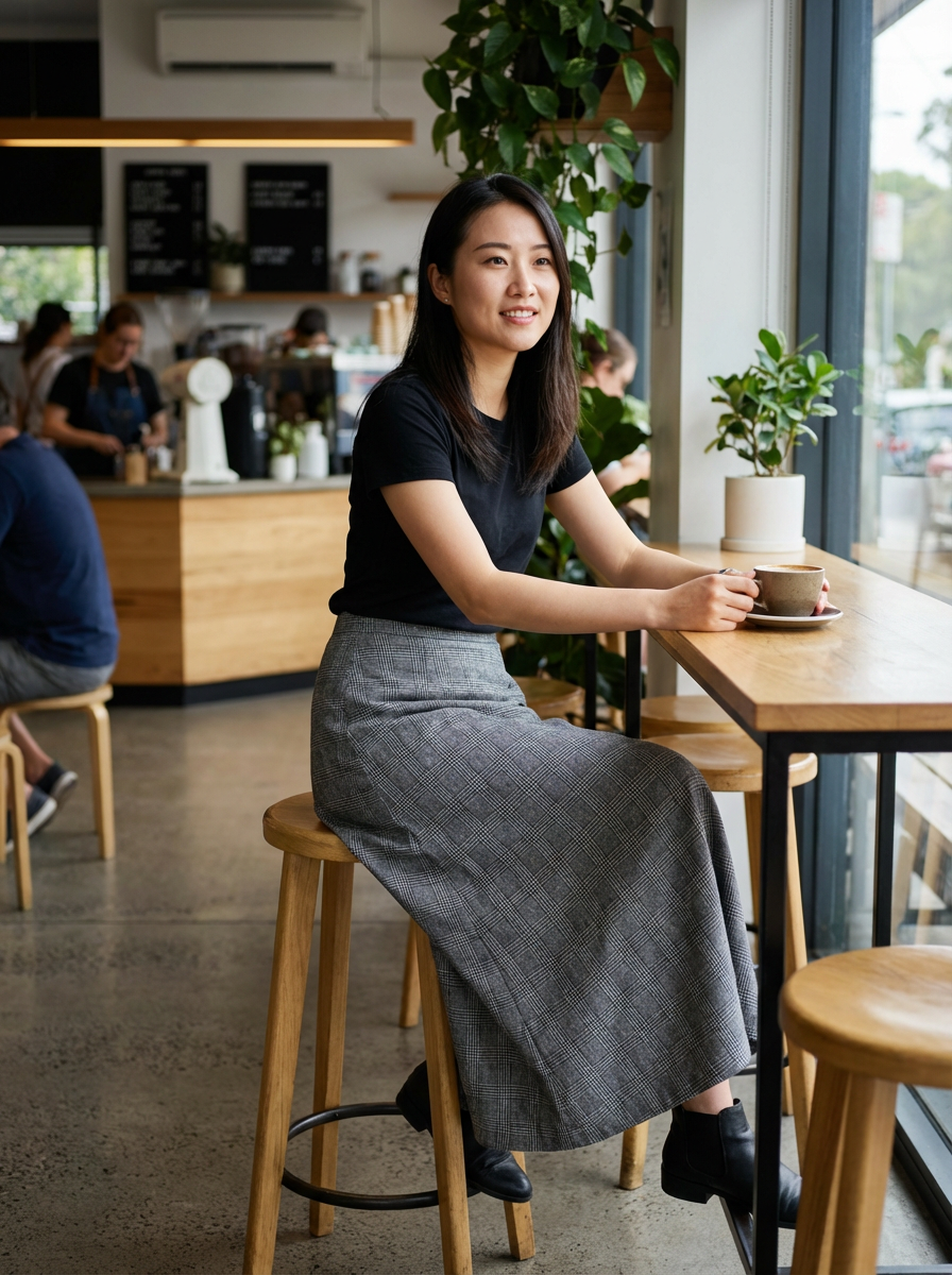 model in hipster coffee place with coffee cup on table
