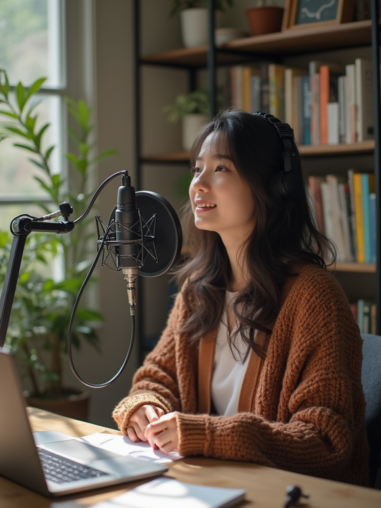 model in home podcast studio, wearing cozy cardigan , desk microphone setup, books and plants in background, natural lighting, approachable aesthetic