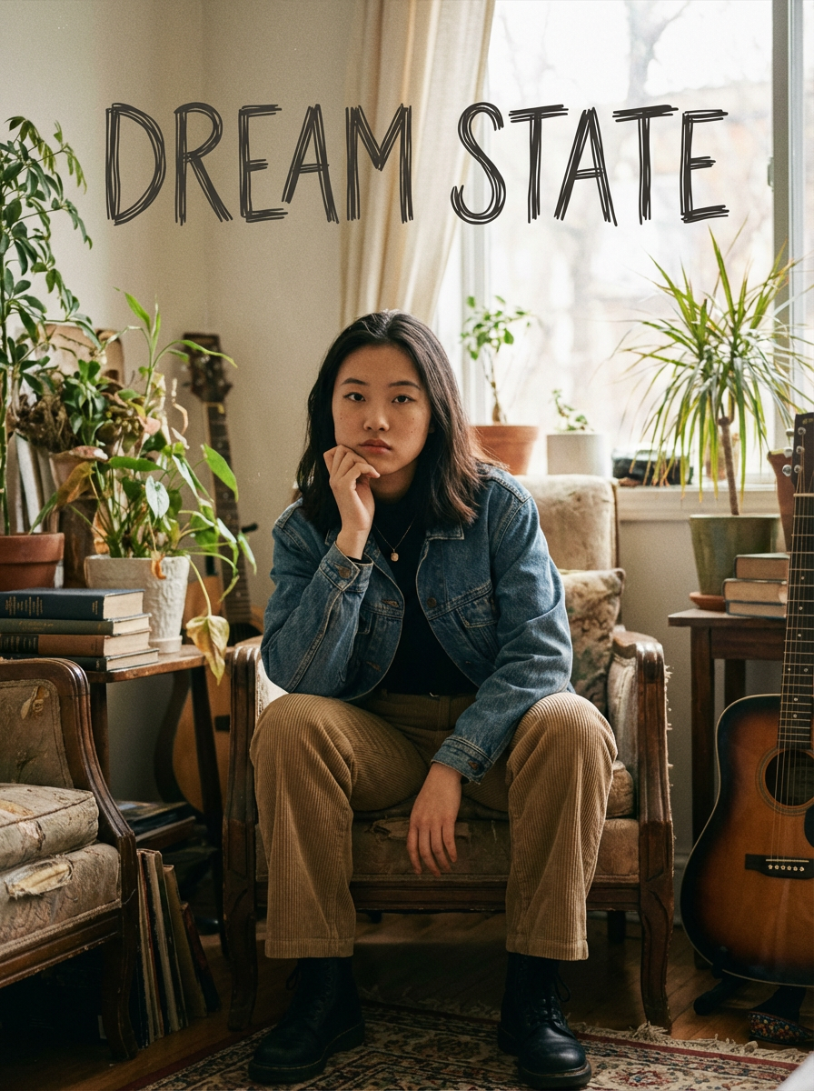 model in indie album cover style, artistic portrait, unique composition, dreamy aesthetic, vinyl cover worthy