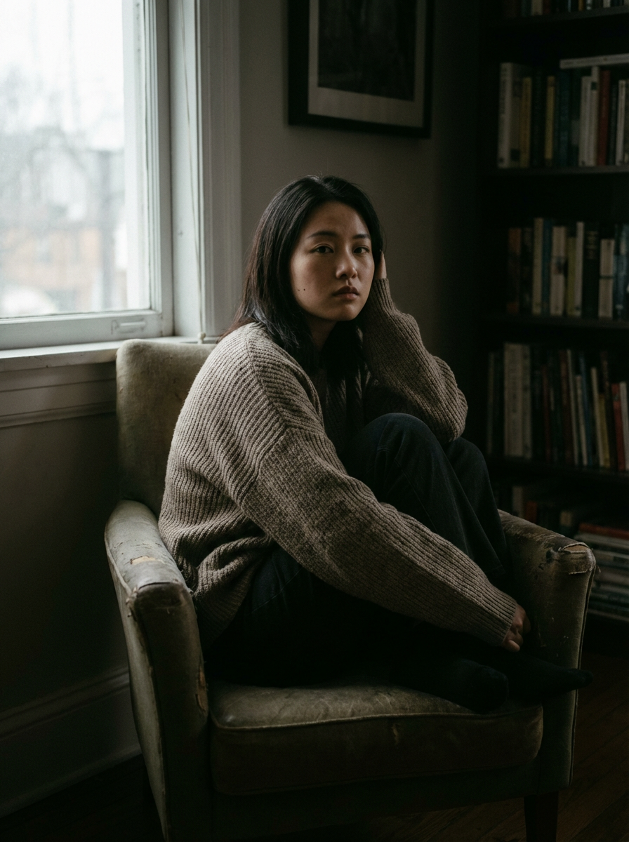model in intimate artistic portrait, soft moody lighting, authentic vulnerable expression
